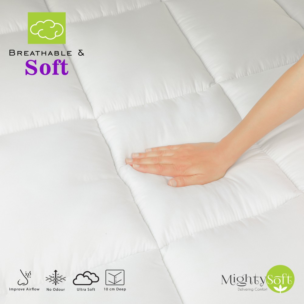 An affordable solution to revitalize your existing mattress. Mighty Soft 10cm mattress topper is thick and plump to give you the luxurious hotel-like feel and does not produce any creaking sound, to minimize sleep disruptions, ensuring a good night’s sleep