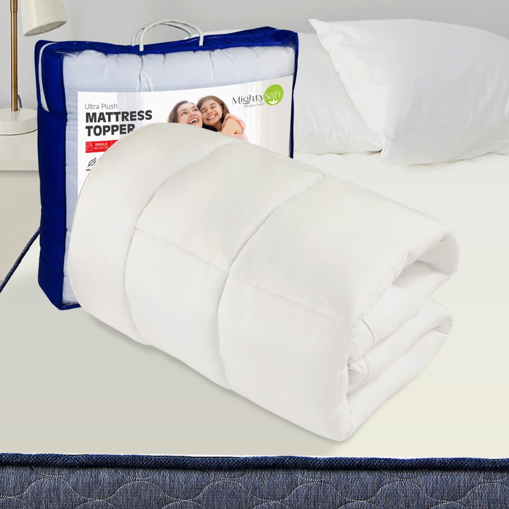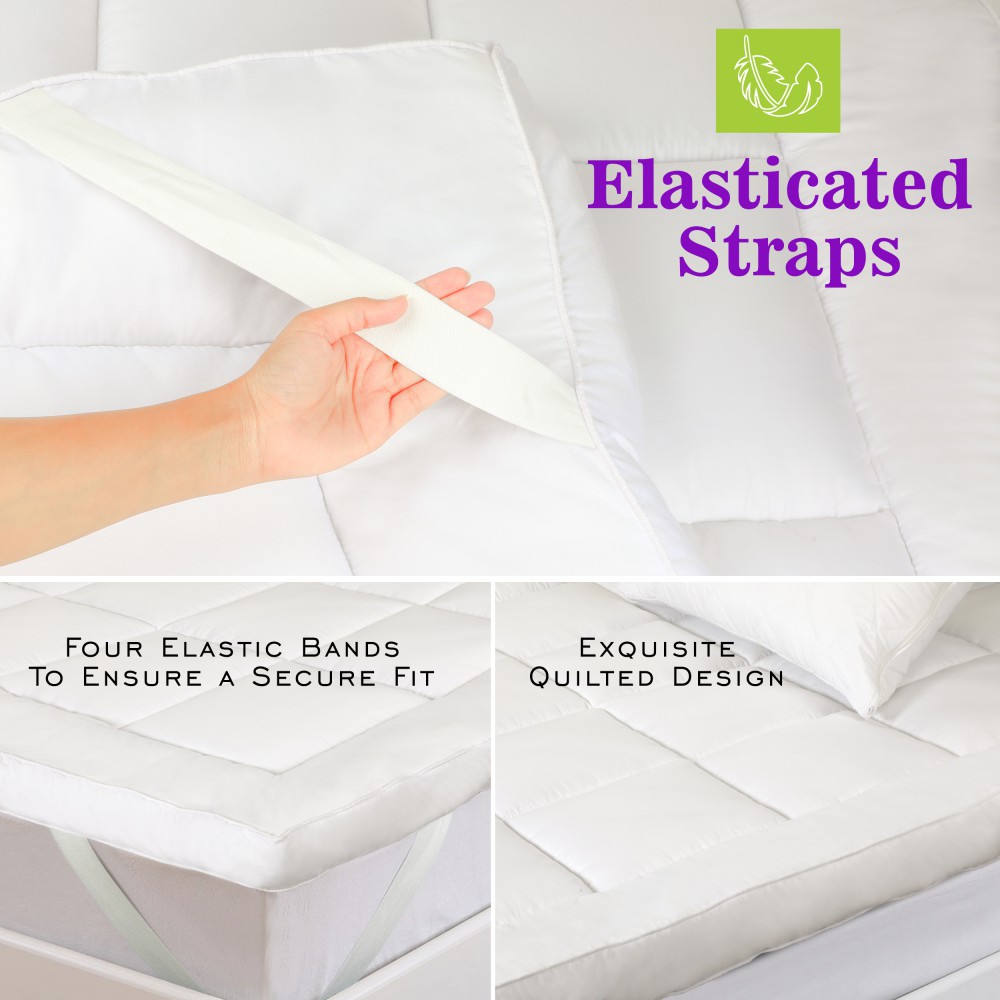 Mighty Soft soft mattress topper fits snugly around the mattress with the help of four durable elastic straps on each corner that does not rip or tear easily